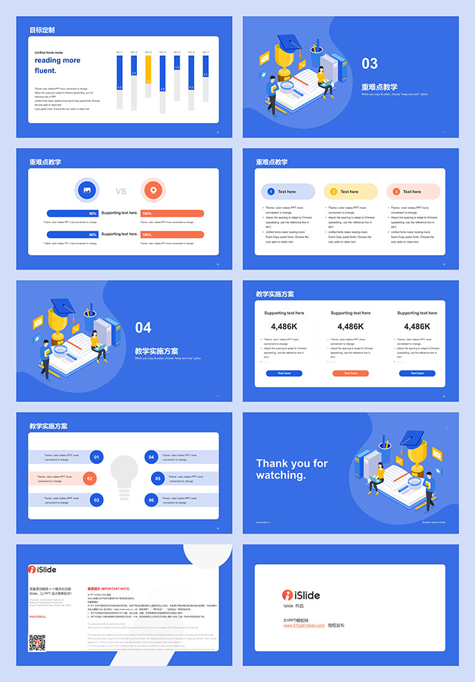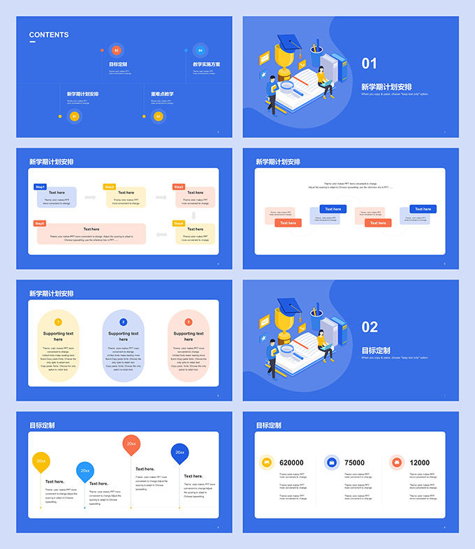 简介:蓝色插画风新学期开学季PPT模板,本模板共17P,含新学期计划、目标定制、重难点教学等板块。以蓝色为底,搭配奖杯、书籍等插画元素,封面采用简约流体几何设计,内页为扁平化版式,蓝黄红配色,适用于开学第一课、工作汇报等场景。标签:新学期,开学季,开学第一课。