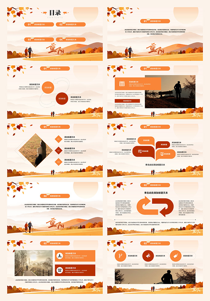 简介:孝行天下——重阳节孝亲敬老活动策划PPT模板,本模板共23P,暖黄配色,融入秋景、散步老人、落叶红日等手绘元素,搭配手写字体与扁平化版式,营造温馨大气氛围,适用于孝亲敬老活动策划与展示场景。标签:孝行天下,孝亲敬老,重阳节。