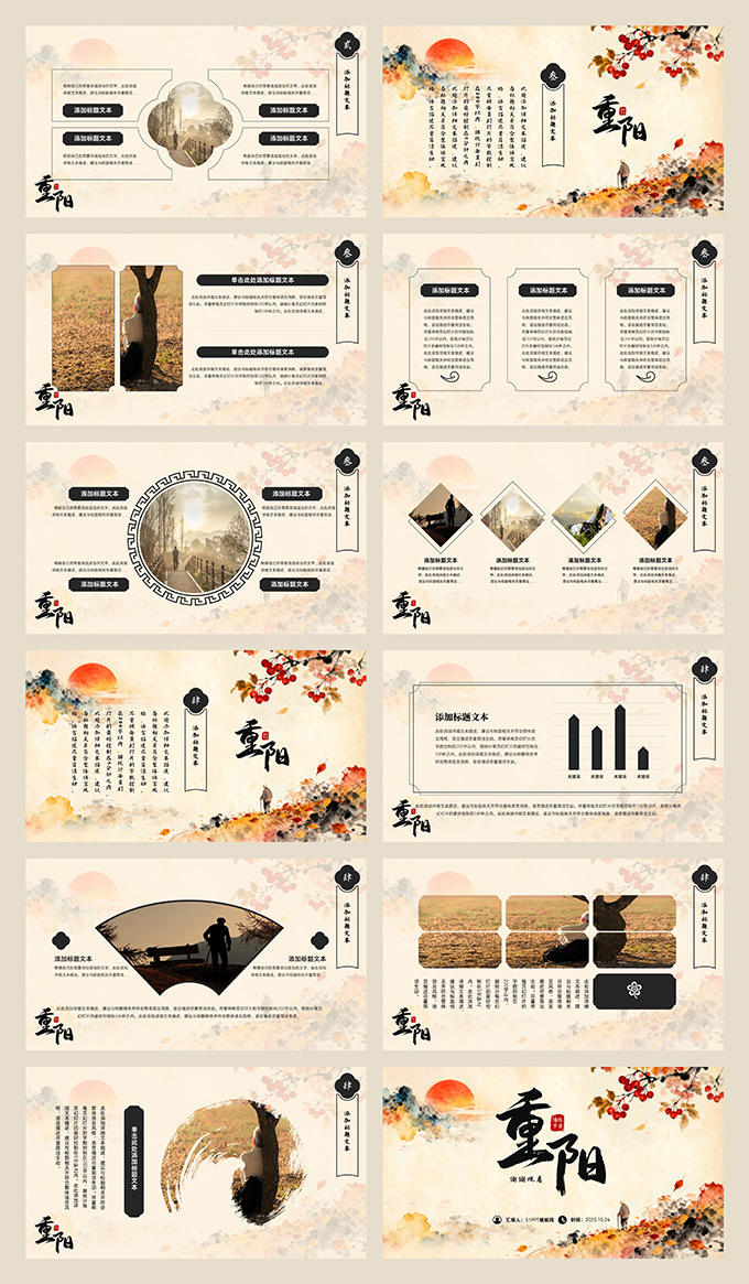 简介:简约中国风传统节日重阳节PPT模板,本模板共23P,以怀旧古风为底,融入夕阳、茱萸、拄拐老人等水墨元素,搭配手写毛笔标题,整体色调典雅,版式简约,尽显传统节日诗意,适用于主题班会与传统文化讲座。标签:重阳节,传统节日,重阳。