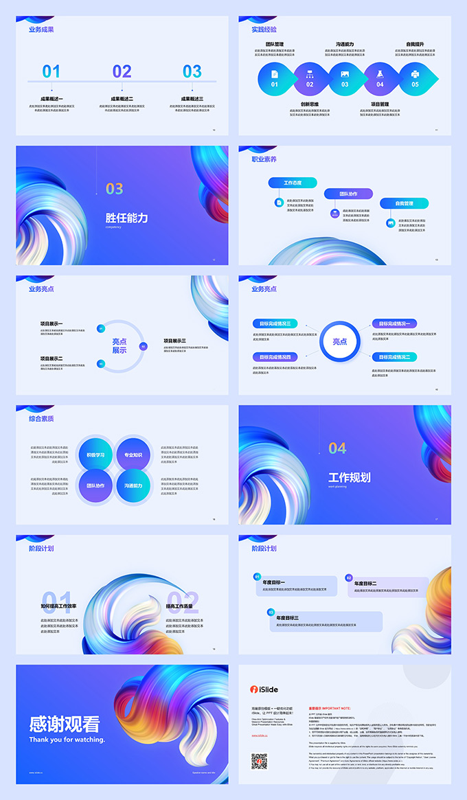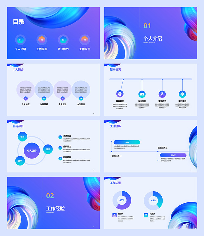 简介:个性多彩教育培训竞聘述职PPT模板,本模板共20P,蓝紫渐变背景,中央以抽象流体艺术造型呈现动态螺旋结构,搭配简约标题封面与渐变配色版式,适用于教育培训、竞聘述职等多种场景。标签:教育培训,竞聘,述职。