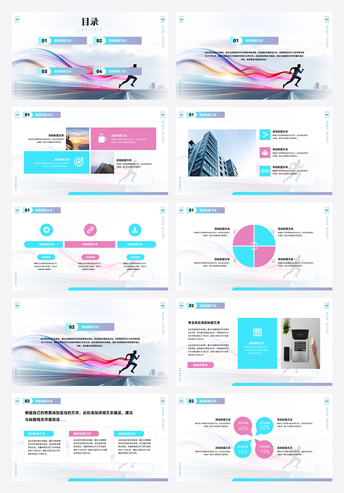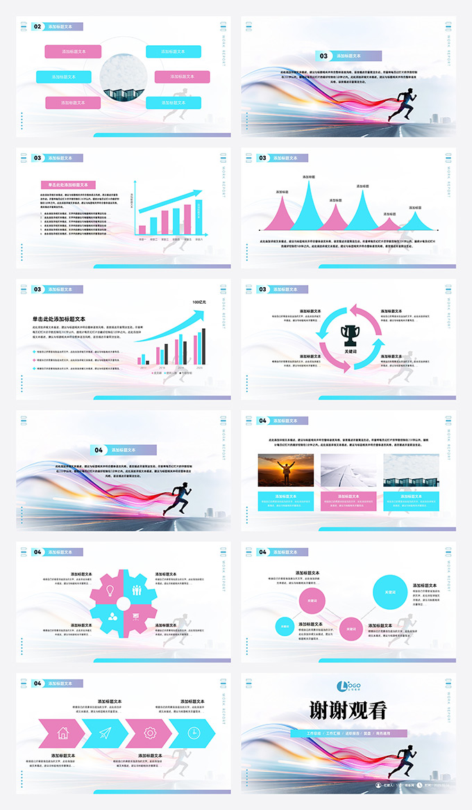 简介:奔跑励志风商务工作总结报告PPT模板,本模板共23P,以奔跑的剪影人物和身后活力动感的彩色丝带为特色,传递积极向前的力量。简约大气的封面设计,结合蓝粉配色,既显专业又不失活力。扁平化简约商务版式内容页,布局清晰,非常适合用于工作总结与汇报,激励团队持续奋进,共同追逐成功梦想。标签:励志,工作总结,工作报告。