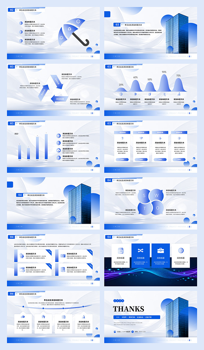 简介:渐变蓝简约商务项目计划书PPT模板,本模板共23P,采用丝绸质感波浪线背景,搭配渐变几何与商务高楼主图,封面简约大气。渐变蓝配色高级沉稳,内容页图表具阴影层次,适用于项目计划、汇报及路演。标签:计划书,项目计划书,项目汇报。
