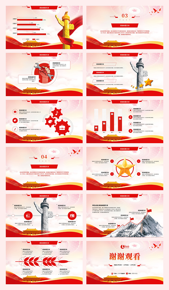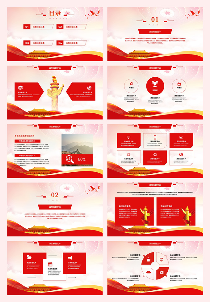 简介:简约大气党建工作汇报PPT模板,本模板共23P,设计庄重简约,以红色为主色调,融汇飘带、和平鸽等经典元素,寓意深远。版式大气扁平,专为党建工作汇报、党课教育等场合打造。标签:党建工作汇报,党建。