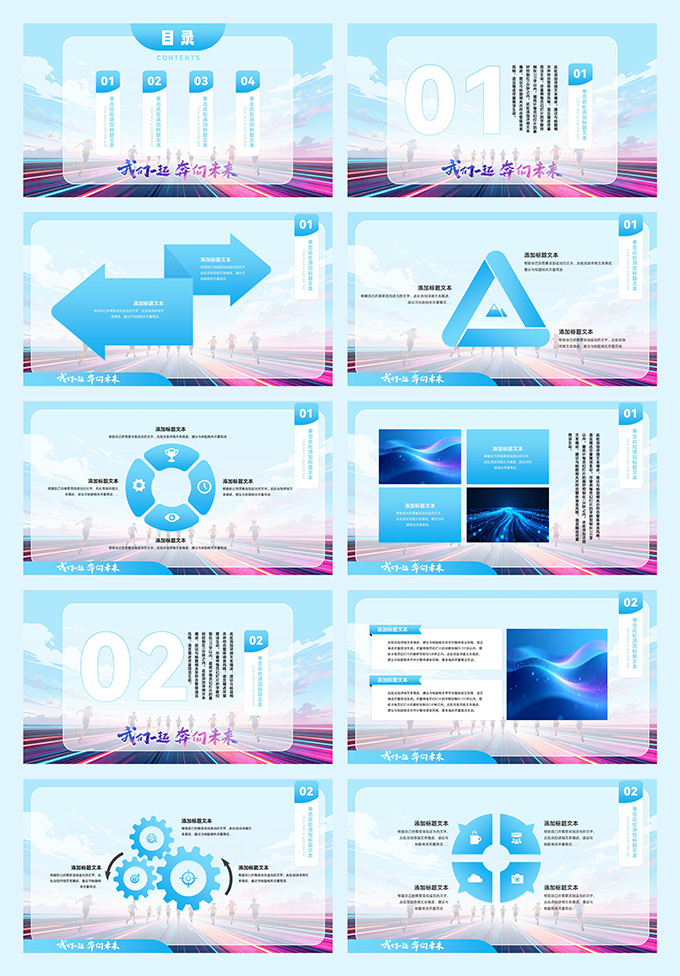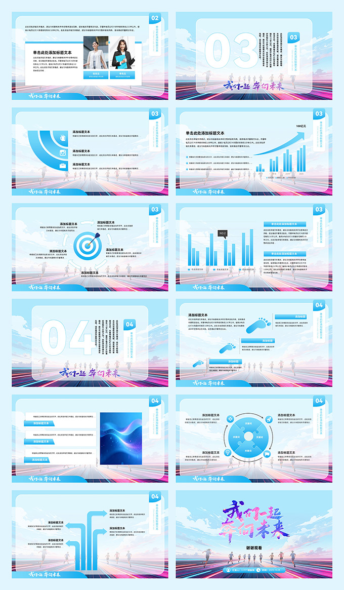 简介:我们一起奔向未来——个人工作总结报告PPT模板,本模板共23P,采用奔向远方大图背景,搭配手写体封面与渐变蓝配色,版式简约商务,适用于个人总结、工作汇报等场景。标签:我们一起奔向未来,个人总结,个人汇报。